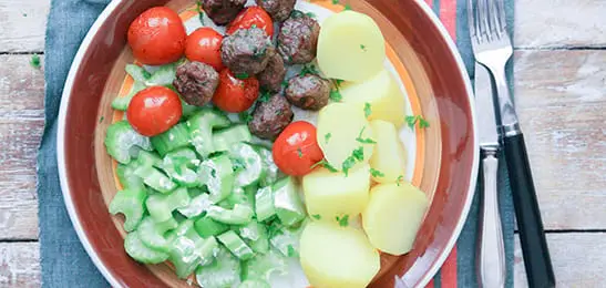 Roer de zuivelspread door de bleekselderij en serveer bij de aardappelen en het vlees.