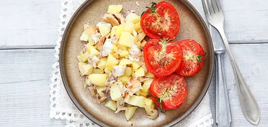 Recept van het Voedingscentrum: Warme aardappelsalade met forel en gegrilde tomaat