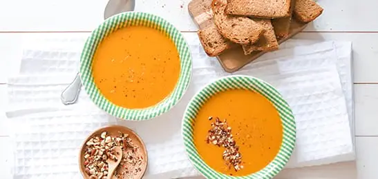 - Verdeel het notenkruim op de soep en serveer het brood bij.