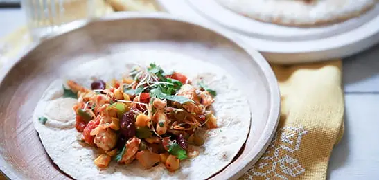Schep de alfalfa en koriander door het groente-kipmengsel en verdeel over de wraps.